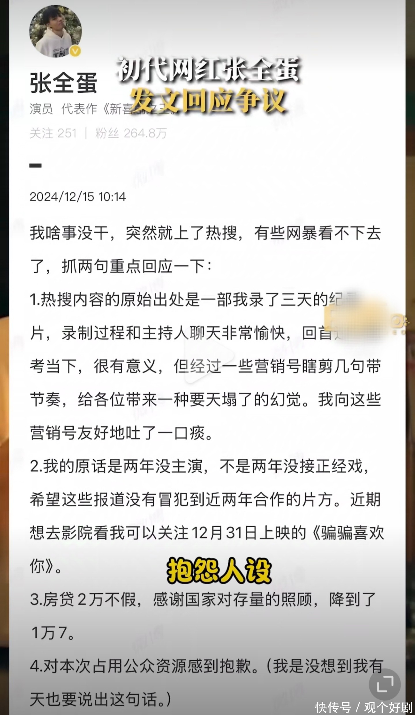 随着舆论的不断发酵,12月15日,张全蛋在社交平台上发文澄清此事,表示自己的原话是两年没主演,不是两年没接正经戏,希望这些报道没有冒犯到近两年合作的片方,房贷2万不假,但已经降到了1.7万,最后张全蛋表示对本次占用公共资源感到抱歉。
